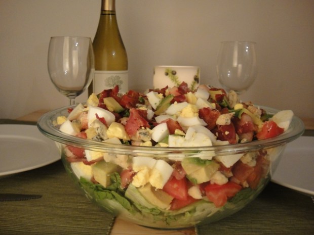 Hitinn í borginni hefur lítið sem ekkert lækkað, sólin skín og á daginn fer hitinn ekki undir þrjátíu gráðurnar. Ég var samt sem áður mjög svöng í gær og ákvað þess vegna að búa til matarmikið salat. Ég hef oft fengið Cobb salat hjá pabba mínum og það er alveg himneskt. Með uppskriftina frá honum og uppskrift sem ég fann á Smitten Kitchen til hliðsjónar bjó ég til alveg svaðalega gott salat. Cobb salatið var fyrst búið til á fjórða áratugnum á veitingastað í Hollywood og var nefnt eftir eiganda staðarins, Mr. Robert Cobb. Ég held sjálf að þetta salat geti ekki klikkað enda er það samansett af svo bragðgóðu hréfni. Ég meina, það er beikon í þessu! Þetta tók okkur svolítinn tíma að undirbúa en við vorum ekkert mjög skipulögð í gærkvöldi. Það er best að byrja á að steikja kjúklinginn (hann þarf að kólna áður en honum er bætt út í salatið) og harðsjóða eggin.