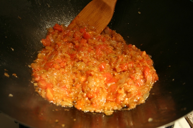 Bætið við kóríander, kardimommu, mangó dufti, rauðum og svörtum pipar. Hrærið vel saman og steikið í smá stund. Bætið við tómatinum og matreiðið þangað til olían fer að skilja sig frá (ca. 6 mínútur).