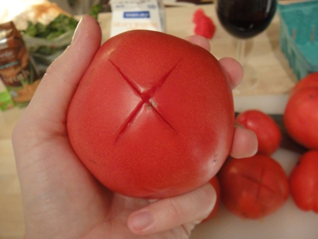 Takið hýðið af tómötunum með þessari aðferð: Skerið ‘x’ í tómatana og setjið þá í pott með sjóðandi vatni, leyfið þeim að liggja í vatninu í 30 – 40 sekúndur. Veiðið tómatana upp úr og þá ætti hýðið að renna af auðveldlega. Hendið hýðinu og grófsaxið tómatana.