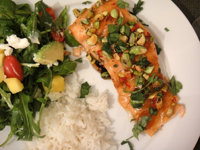 Lax með mangóchutney, pistasíuhnetum og kóríander