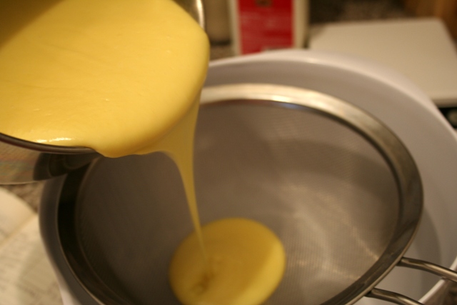 Hitið 420 ml af mjólkinni og 100 g af sykrinum þangað suðu hefur verið náð (fylgist vel með því annars mjólkin mun sjóða upp úr pottinum). Þeytið restinni af mjólkinni (60 ml) saman við 50 g af sykrinum, hveitinu og eggjarauðunum í skál á meðan beðið er eftir suðunni. Blandið þessu saman við mjólkurblönduna þegar suðan hefur komið upp. Hellið blöndunni yfir í hreinan pott og eldið yfir meðalháum hita. Hrærið stanslaust þangað til suðan kemur upp og haldið áfram að hræra í blöndunni í 2 mínútur eða þangað til hún hefur þykknað. Slökkvið undir pottinum og hellið blöndunni í gegnum síu í stóra skál.