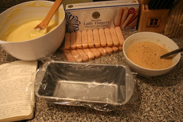 Takið eitt kex í einu, dýfið því ofan í kaffisýrópið og raðið síðan neðst í formið. Endurtakið og raðið kexinu niður hlið við hlið þangað til botninn á forminu hefur fyllst. Hver röð ætti að vera 8 ladyfingers. Hellið því næst 1/3 af búðingnum jafnt yfir kexið. Endurtakið tvisvar sinnum, dýfið kexinu í sýrópið, leggið í eina röð, hellið 1/3 af búðingnum jafnt yfir, dýfið kexinu i sýrópið og hellið síðasta þriðjungnum jafnt yfir og ljúkið með því að leggja eina röð af ladyfingerskexi. Hyljið síðan með plastfilmu og setjið inn í ísskáp og geymið þar í a.m.k. 6 klukkutíma (helst yfir nótt).