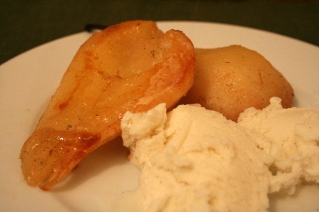 Þessi réttur er guðdómlegur. Sjálf elska ég ávexti, karamellu og vanilluís þannig að þetta er ekkert sérstaklega flókið dæmi. En þetta er líka svo góð tilbreyting frá þungum súkkulaðiríkum eftirréttum sem venjulega fylgja álíka þungri máltíð á þessum tíma árs. Þetta er líka góð leið til að matreiða ávextina (því þetta þarf auðvitað ekki að einskorðast við perur) sem fást í matvörubúðunum heima á Íslandi. Þið vitið, þessa hörðu og óþroskuðu sem virðast aldrei ná að bragðast vel.
