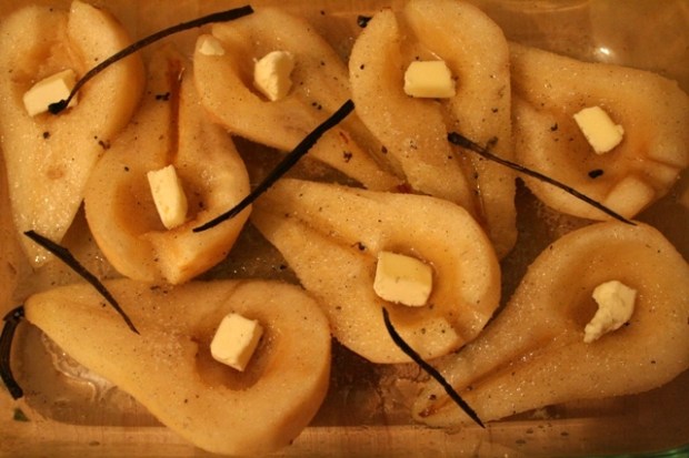 Ég fór á bóndamarkaðinn í dag og keypti þessar dýrindis perur. Ég vissi að ég væri að fara að ofnbaka þær þannig að ég passaði að velja þeir hörðustu – þær eru langbestar þannig. Ég átti vanillustöng frá því um jólin en annars hefði ég líklega reynt að breyta þessari uppskrift því vanillustangir eru alveg fokdýrar(!). Það er auðvitað lítið mál að sleppa vanillunni, karamellan sem myndast við að ofnbaka smjör og sykur þarf ekki nauðsynlega á henni að halda.