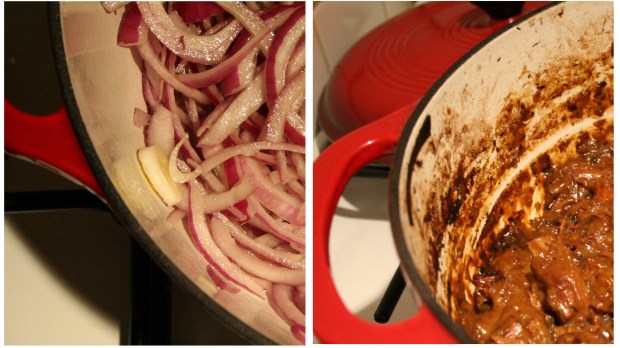 Takið fram stóran eldfastan pott og setjið yfir lágan hita. Hitið ólívuolíuna í pottinum og bætið rauðlauknum út í. Steikið yfir lágum hita í ca. 10 mínútur eða þangað til að laukurinn verður glær og linur. Ekki leyfa lauknum að brúnast.