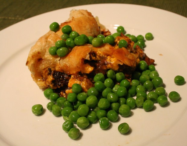 Ég var svo spennt fyrir því að elda þennan rétt að ég vaknaði eldsnemma í morgun og byrjaði að elda áður en ég þurfti að mæta í vinnuna. Ég vissi að ef ég byrjaði að elda þegar ég kæmi þreytt heim úr vinnunni þá yrði ekki matur á boðstólum fyrr en undir  miðnætti þar sem kássan þarf rúma tvo tíma inni í ofni. Ég hitaði svo bara kássuna upp í ofninum þegar ég kom heim, drakk eitt rauðvínsglas, fiktaði í ofninum, brenndi á mér puttana og fór svo að fletja deigið. Elmar vildi samt meina að ég hlyti nú að vera orðin svolítið meira en manísk fyrst ég væri farin að vakna fyrir allar aldir með matreiðslufiðring í fingurgómunum. En útkoman var svo frábær að manían hlýtur að vera kærkomin. Þetta er ekta vetrarmatur, bragðmikil kjötkássa í fíngerðu deigi með smjörsteiktum grænum baunum. Við mælum með þessu!