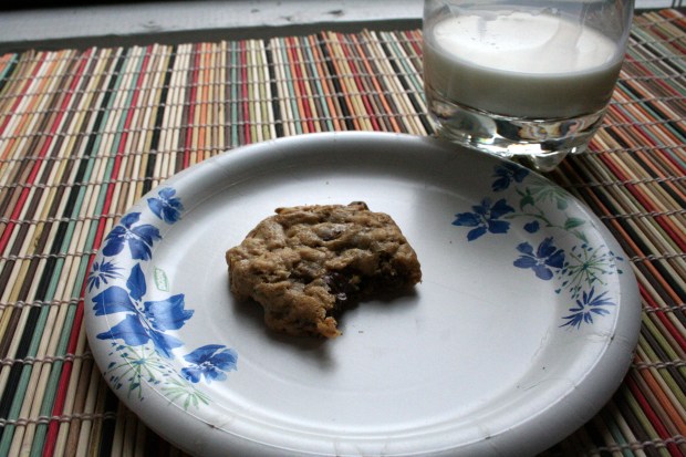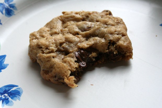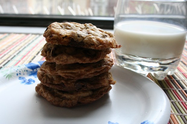 Ég var búin að einsetja mér að baka bara kanilsnúða en þegar ég fór að skoða uppskriftir á netinu þá rakst ég á þessa girnilegu smákökuuppskrift og ég stóðst hreinilega ekki mátið. Ég breytti henni aðeins, sleppti hnetunum (því þær kostuðu offjár úti í búð) og jók aðeins magnið af höfrum í staðinn. Þegar fyrsta platan kom út úr ofninum þá stóð ég við eldhúsvaskinn, þambaði mjólk og hámaði í mig nokkrar heitar smákökur. Kökurnar eru stökkar á hliðunum og mjúkar að innan, hafrarnir gefa þeim svolítið bit og súkkulaðið gerir gæfumuninn, sérstaklega þegar kökurnar eru enn heitar og súkkulaðið er bráðið.