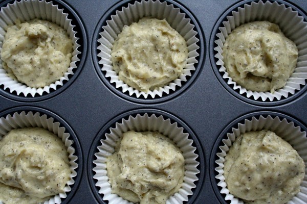 Takið fram meðalstóra skál. Blandið hveitinu, lyftiduftinu, saltinu og telaufunum saman. Bætið síðan helmingnum af hveitiblöndunni saman við smjörblönduna. Ekki nota þeytara á þessu stigi, best er að blanda þessu vel saman með sleif til að missa ekki allt loft úr deiginu (annars verða kökurnar alltof þéttar í sér).  Hellið síðan mjólkinni saman við og síðan restinni af hveitiblöndunni og hrærið þar til allt hefur blandast saman.