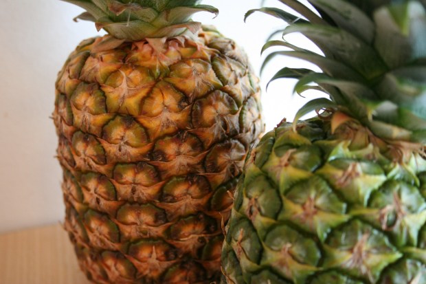 Skerið ananasinn í tvennt, langsum, og skerið aldinkjötið úr. Saxið aldinkjötið og setjið til hliðar.