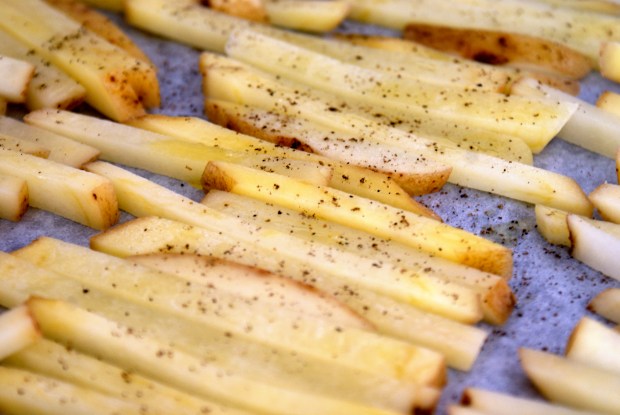 Leggið bökunarpappír á ofnplötu og setjið franskarnar á plötuna. (Ég þurfti reyndar að nota tvær ofnplötur svo hver kartafla fengi pláss til að þorna aðeins í ofninum, ég stillti ofninn á blástur til að dreifa hitanum jafnt og skipti svo um stað á plötunum í miðjum bakstri). Penslið kartöflurnar með ólívuolíu og sáldrið síðan salti og pipar yfir.