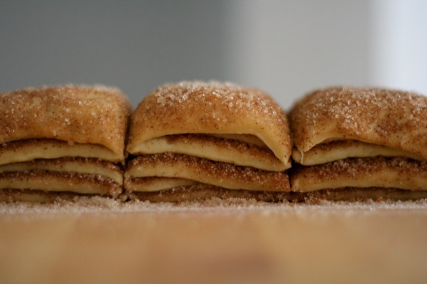 Sáldrið hveiti yfir borðflöt og fletjið deigið í ca. ferhyrning, 30 cm á breidd og 50 cm á lengd. [Ef það nær ekki 50 cm, fletjið það þá bara eins langt og það kemst.] Notið bursta til að dreifa smjörinu yfir allt deigið. Sáldrið síðan kanilsykursblöndunni yfir allt deigið – þetta mun virðast mjög mikið af sykri en skellið því bara öllu á.