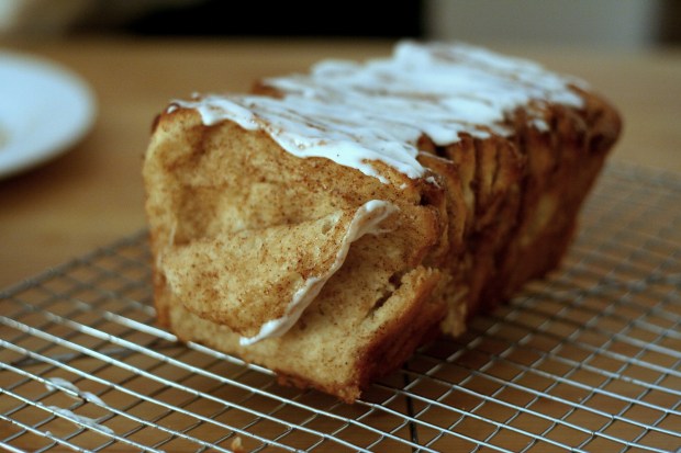 Setjið grindina í miðjan ofninn og hitið ofninn í 350°F/180°C. Setjið kanillengjuna í ofninn og bakið í 30 til 35 mínútur eða þar til toppurinn er orðin vel brúngylltur á litinn. Ef að toppurinn er rétt svo gylltur og virðist bakaður þá geti miðjan ennþá verið hrá. Leyfið lengjunni að verða fallega (og ágætlega dökk) brúngyllt. Það er líka hægt að nota tannstöngul til að gá hvort brauðið sé bakað í gegn.