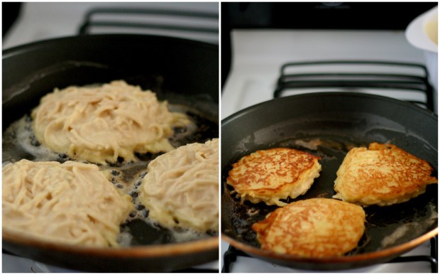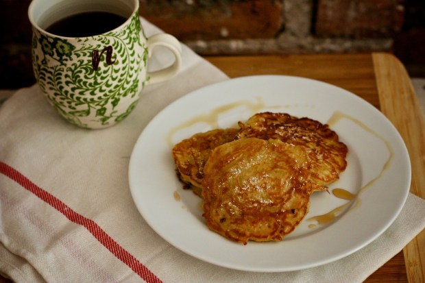 - 3 meðalstór epli, afhýdd og snyrt, rifin (ég notaði græn epli svo að pönnukökurnar yrðu ekki of sætar)