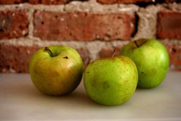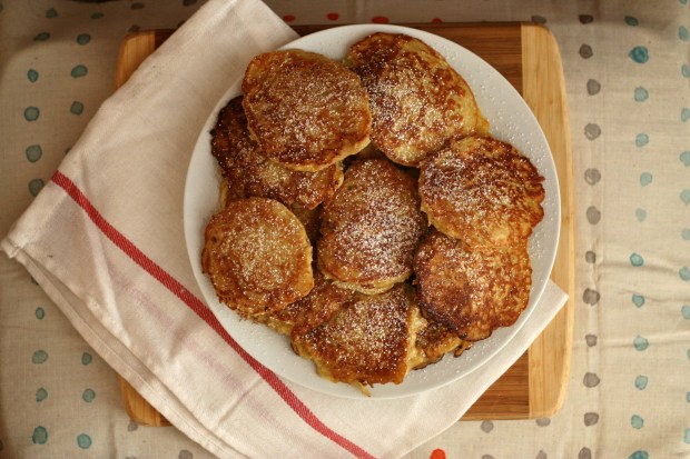 Eplin eru orðin ansi fyrirferðamikil á markaðnum og ég nældi mér í nokkur til að henda í þennan morgunmat. Þetta eru mjög skemmtilegar pönnukökur. Ég notaði græn epli til að vera með næga sýru sem mótvægi við sætuna í deiginu og útkoman var mjög skemmtileg samblanda af fersku og sætu. Ég reif líka niður smá sítrónubörk og setti út í deigið og það gerði þær jafnvel enn ferskari. Það má líka leika sér með kryddið sem sett er út í. Ég notaði kanil en ég hugsa að ég noti kardemommuduft næst, mér er farið að finnast kanillinn vera aðeins of hefðbundinn með eplum. Þetta er mjög skemmtileg tilbreyting frá hinum klassísku pönnukökum því áferðin er allt önnur og þar sem það er nú komið haust þá tel ég allt eplatengt vera mjög svo við hæfi.