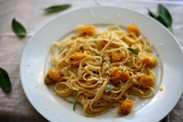 Takið fram meðalstóran pott og bræðið smjörið við lágan hita á meðan pastað sýður. Leyfið smjörinu að brúnast, fyrst mun myndast froða þegar smjörið skilur sig og svo tekur það á sig brúnan lit. Þegar smjörið er orðið brúnt og gefur frá sér mildan hnetukeim er söxuðu salvíulaufunum bætt saman við. Hrærið þeim saman við. Bætið lauknum og hvítlauknum saman við og eldið þar til laukurinn hefur mýkst. Bætið þvínæst graskersteningunum saman við og eldið þar til graskerið er orðið heitt.