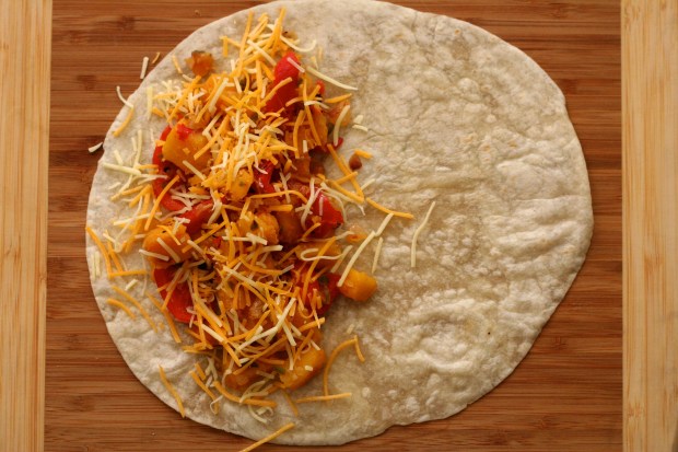 Dreifið nokkrum matskeiðum af graskersblöndunni yfir hálfa hveitiköku og sáldrið osti yfir. Leggið kökuna saman og burstið báðar hliðar með smá grænmetisolíu. Leggið á heita steikarpönnu og steikið báðar hliðar þar til gylltar og osturinn hefur bráðnað. Endurtakið með allar tíu. Skerið hálfmánana í fjóra bita og berið fram t.d. með salsa, guacamole og/eða sýrðum rjóma.