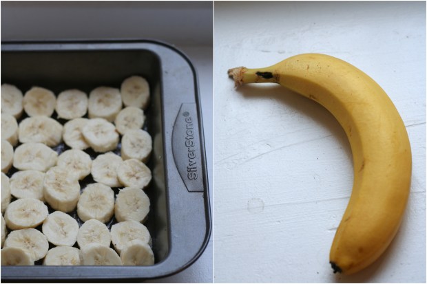Skerið banana í 1 cm þykkar sneiðar. Raðið sneiðunum þétt yfir sykurinn í forminu. Sáldrið smá sítrónusafa yfir bananana. Setjið til hliðar.