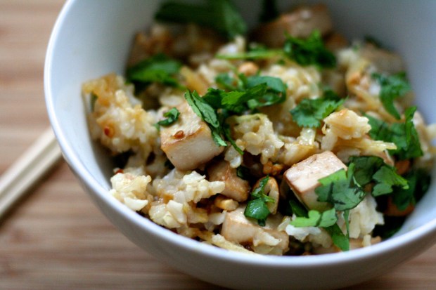Bætið hrísgrjónunum og tófúinu út á pönnuna, blandið öllu vel saman og steikið þar til allt er orðið heitt í gegn.