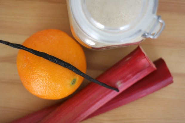 Skerið rabarbarann niður í 2 sm langa bita og setjið í pott. Hellið sykrinum í pottinn. Skerið vanillubaunina í tvennt og skafið fræin úr, setjið fræin og belginn ofan í pottinn. Kreistið safa úr einni appelsínu yfir. Setjið yfir hita og náið upp suðu, hrærið aðeins í pottinum og leyfið að sjóða í 2 – 3 mínútur. Lækkið hitann og leyfið að malla í ca 30 – 40 mínútur. Hrærið af og til í pottinum, skafið með fram hliðunum og potið í rabarbarabitana til að leysa þá í sundur.