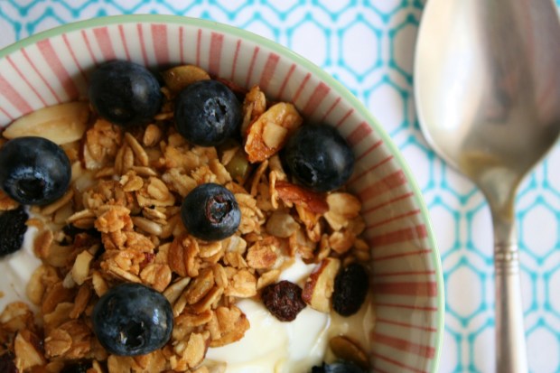 Og núna á ég stóra krukku af granóla inni í ísskáp og get búið mér til þennan dýrindis morgunmat fyrir miklu miklu minna en átta dali. Ég set smá hreina gríska jógúrt í skál, set smá hunang út í jógúrtið og hræri, sáldra granóla yfir og toppa með ferskum berjum (í þetta sinn bláberjum). Ekki láta plata ykkur til að kaupa lítinn poka af granóla á himinháu verði því heimaristað granóla er svo einfalt og svo ljúffengt. Uppskriftina má auðvitað laga að því sem til er í skápunum hjá ykkur – notið þær hnetur sem þið hafið við höndina, sleppið sykrinum ef þið eruð ekki sömu sætindagrísir og ég og skellið smá þurrkuðum ávöxtum eða súkkulaðidropum út í ef slíkt heillar ykkur.