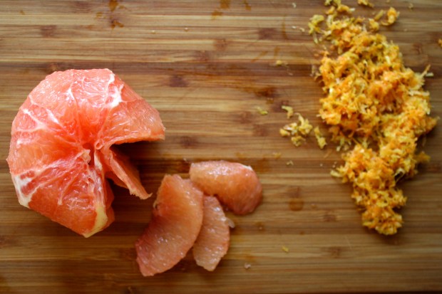 Rífið börkinn af greipávextinum með fínu rifjárni ofan á bretti. Hellið sykrinum yfir börkinn og notið bakið á skeið til að nudda berkinum saman við sykurinn. Setjið síðan 2 msk af sykrinum ofan í hveitblönduna, hrærið og geymið afganginn af greipsykrinum.
