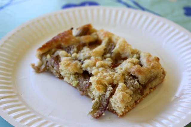 Rabarbarinn er látinn liggja í sykri og sítrussafa áður en honum er dreift yfir kökudeigið og það gerir það að verkum að hann heldur sínu sérkennilega súra bragði án þess að það valdi andlitsgrettum. Þið skulið samt hella safanum sem rabarbarinn liggur í yfir kökuna til að fá rétt bragð og sætumagn.