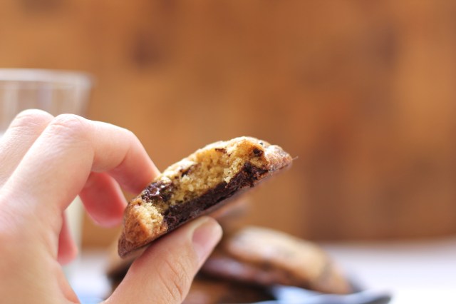 Því ætla ég að ,svindla’ svolítið og bjóða ykkur frekar upp á þessar súkkulaðibitakökur sem Embla Ýr bjó til handa okkur um daginn. Embla er smákökusnillingur og þá sérstaklega þegar það kemur að súkkulaðibitakökum. Hún saxar dökkt súkkulaði mjög gróflega þannig að maður bítur í gegnum stóra og stökka súkkulaðimola. Uppskriftin sem hún studdist við er frá Baked bakaríinu í Brooklyn og við erum mjög ánægðar með útkomuna. Þessari smákökur eru sjúklega góðar og passa einstaklega vel við ískalda mjólk.