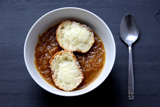 Franska lauksúpan hennar Juliu Child er þó undanskilin þessari súpufælni minni. Ég hef skrifað um hana hérna fyrir löngu síðan, áður en ég fattaði hvernig myndavélar og lýsing virkuðu og því miður gera myndir mínar þar þessari ljúffengu súpu engan greiða. Mig langaði því til að skrifa nýja færslu með nýjum myndum til að hvetja ykkur til að malla þessa súpu því hún ætti engan að svíkja. Hún er mjög einföld en krefst þó smá þolinmæði. Það er mikilvægt að gefa lauknum tíma til að verða dökkgylltur á litinn svo að útkoman verði sem allra best, þetta gæti tekið rétt rúman klukkutíma. Ég stend alltaf í táraflóði þegar ég er að skera lauk og því hjálpar mér mikið að eiga svona mandólín* sem gerir það að verkum að ég er eldsnögg að skera hann niður.