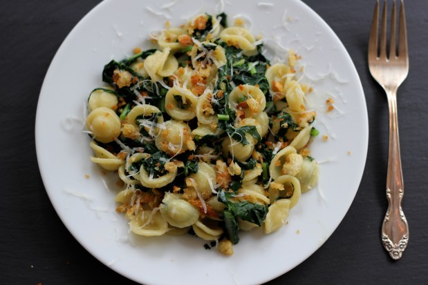 Orecchiette er tegund af pasta sem finnst aðallega í Puglia-héraði á Ítalíu og fæst í flestum matvörubúðum hérna úti. Það má auðvitað skipta því út fyrir annað lítið pasta – eins og skeljar eða jafnvel skrúfur. Aðalhráefnið er grænkál – sem er víst pakkað af alls kyns hollustu – og svo er chili, ansjósur og góður skammtur af hvítlauk. Punkturinn yfir i-ið er pönnusteikt brauðmylsna sem er brakandi stökk og gefur réttinum mikinn karakter.