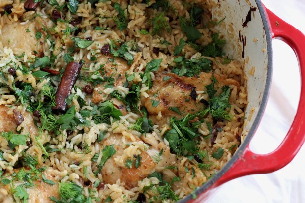 [*Ottolenghi segir í uppskriftinni að elda yfir lágum hita á eldavélinni í pönnu í 30 mínútur. Ég gerði það í fyrsta skipti sem ég bjó til þennan rétt og kjúklingurinn var ennþá frekar hrár eftir þann tíma og ég lenti í alls kyns vandræðum með hrísgrjónin. Eftir smá rannsóknir á netinu sá ég að fleiri lentu í sama vanda. Ég mæli því með að baka það í lokuðum potti eða eldföstu móti með álfilmu yfir inni í ofni.]