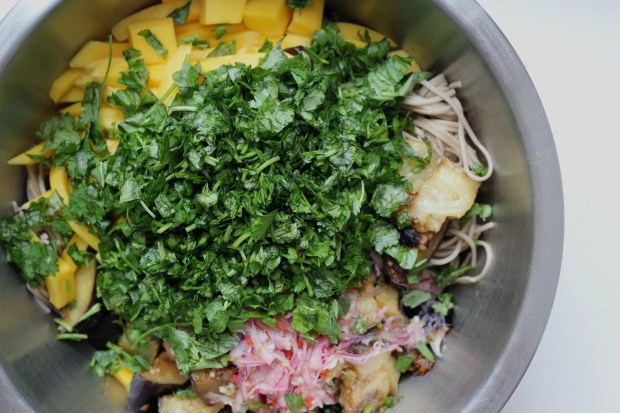 Takið fram stóra skál og blandið saman núðlunum, dressingunni, mangóinu, eggaldinbitunum, lauknum* og helmingnum af kryddjurtunum.