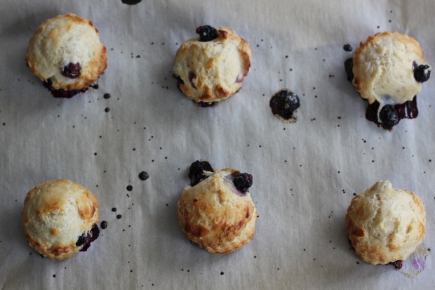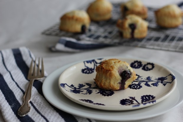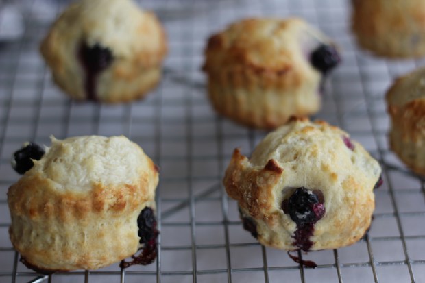 Þessar skonsur gera biðina ögn bærilegri. Ég er með skonsur á heilanum þessa dagana en þar sem þær eru langbestar nýbakaðar þá hef ég setið á mér að kaupa þær úti á kaffihúsi. Joy the Baker setti inn færslu um daginn með uppskrift að einföldum skonsum með bláberjum og hlynsírópi sem ég varð að prófa. Ég keypti því bakka af ferskum bláberjum (með lokuð augu því það er langt í að bláberin þroskist á norðurhveli). Ég bakaði lítinn hluta af skonsunum en frysti restina til að eiga síðar (lesist: til að koma í veg fyrir að ég borðaði þær allar á einum degi). Þær eru fullkomnar – léttar í sér, hæfilega sætar og bláberin fallega fjólublá í ljósu brauðinu. Það má nota frosin ber en þá mun deigið litast af berjunum. En það hefur bara áhrif á ytra útlit, ekki bragð.