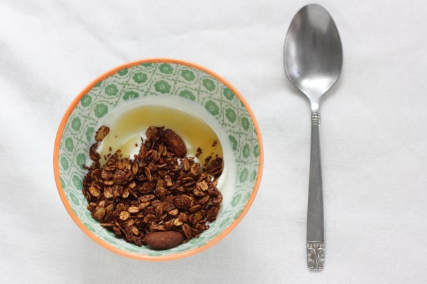Þetta granóla er frekar sætt (ég ætla að minnka aðeins sykurmagnið þegar ég bý það til næst) en það er líka stórgott. Kakó, kókos, möndlum og höfrum er velt upp úr hunangskaramellu og látið ristast í ofni þar til það verður stökkt og gullið. Ég borða það á morgnana með grískri jógúrt og stelst til að sáldra því yfir rjómaís á kvöldin. Svolítið syndsamlegt en ágætis huggun á meðan ég bíð eftir vorinu.