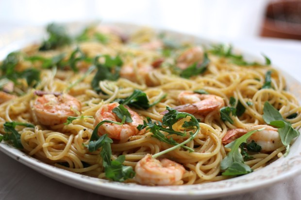 Spagettí með risarækjum og klettasalati