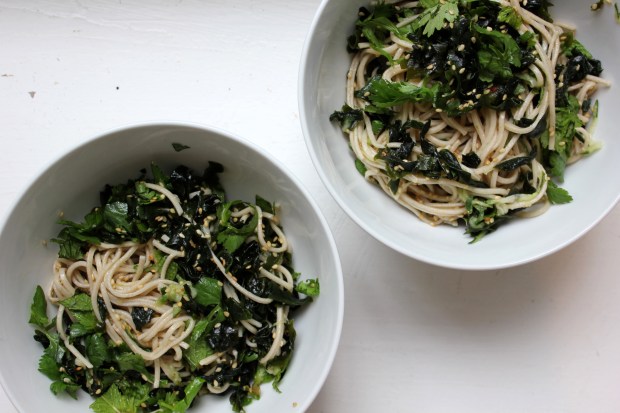 Þessi réttur er kannski ekki allra. Ég er mjög hrifin af þurrkuðum þara og get auðveldlega borðað heilan pakka ein – sérstaklega með bjór. En sumir eru ekki á sama máli og til að fíla þennan rétt þá þarf manni að finnast þari bragðgóður. Annars má örugglega sleppa þaranum og setja ofnbakað eggaldin í staðinn. Jafnvægið í réttinum er með besta móti – ferskleikinn frá agúrkunum og kryddjurtunum vegur vel á móti seltunni í þaranum og sesamfræin gefa smá kröns. Sósan er sæt, súr og með smá chilihita. Þetta er stór skammtur og seðjandi. Hann entist okkur Elmari í þrjár máltíðir.