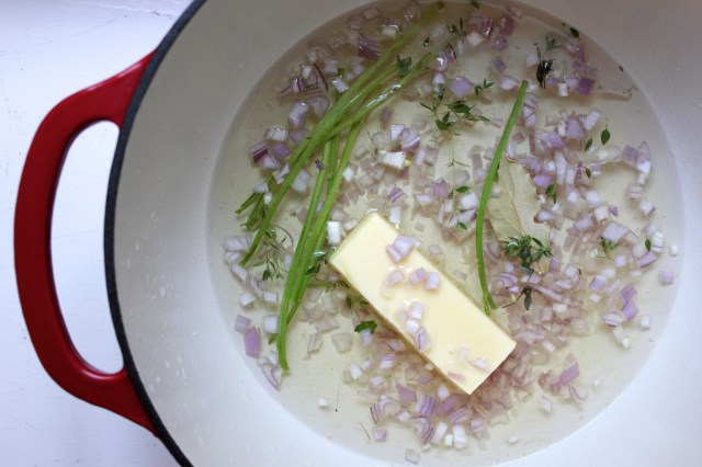 Setjið vínið ásamt lauknum, lárviðarlaufinu, tímjaninu, piparnum og smjörinu í stóran pott. Náið upp suðu og sjóðið í 2 – 3 mínútur svo að áfengið gufar upp og vökvinn minnkar aðeins.