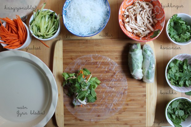 Rúllurnar eru bestar strax og þeim er rúllað upp en þó má vefja plastfilmu utan um þær og geyma á köldum stað í einn til tvo tíma. Við vorum með þessar leiðbeiningar til hliðsjónar þegar við vorum að gera fyrstu rúllurnar. Sósan okkar var frekar sterk og það er gott að miða við þolmörk þeirra sem borða réttinn þegar chilipiparnum er bætt út í sósuna. Rosalega ljúffengt og gott og mun einfaldara og fljótlegra en það lítur út fyrir að vera.