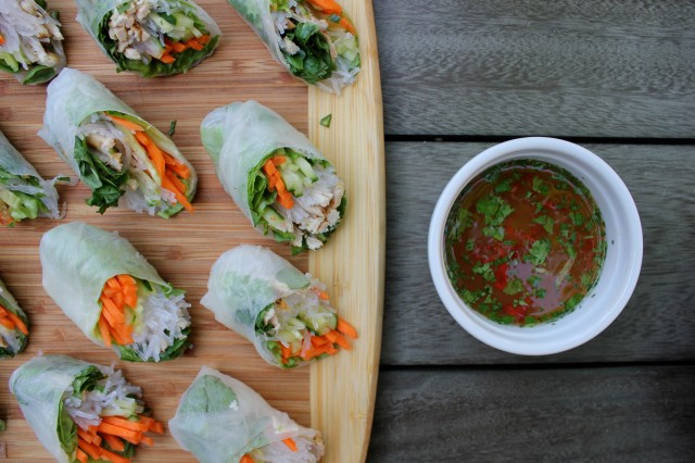 Áður en við fórum til Chapel Hill bjuggum við Elmar til þessar ljúffengu fersku vorrúllur í bakgarðinum. Þær eru mjög viðeigandi á hlýjum (eða í okkar tilfelli, heitum) sumardögum þar sem mann langar aðallega í eitthvað ferskt og létt í magann. Við bjuggum til vorrúllur með kjúklingakjöti en það má auðvitað búa til rúllur með risarækjum eða steikja portóbellósveppi ef fólk borðar ekki kjöt eða fisk.