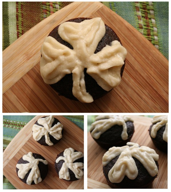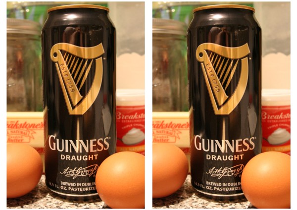 En aftur að uppskriftinni. Þessi uppskrift er upprunalega kaka sem ég hef venjulega sett súkkulaðikrem á. Og hún er furðanlega góð! Ég var ekki alveg viss í fyrsta skipti sem ég bjó hana til og átti svolítið erfitt með að ímynda mér hvernig Guinness, sýrður rjómi og súkkulaði myndu bakast saman. En hún kom mér skemmtilega á óvart. Ég ákvað samt, þar sem dagur heilags Patreks nálgast óðum, að búa til möffins úr uppskriftinni og hafa hvítt krem ofan á. Möffinsin eru mjög góð og heppnast alveg ljómandi vel eins og kakan en ég verð því miður að viðurkenna að kremið sem ég bjó til var alltof sætt – þannig að uppskriftin mun ekki fylgja hér að neðan. Ef þið vitið um góða uppskrift af hvítu kremi þá hvet ég ykkur til að nota hana en ég held samt sem áður að þessi kaka sé best með súkkulaðikremi og bökuð í hringlaga formi með gati í miðjunni. Á smitten kitchen (notið tengil að neðan) er uppskrift að viskíkremi sem ég hef ekki prófað sjálf en hljómar mjög spennandi með þessum kökum.