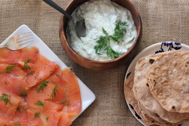 Um daginn bjó ég til þessi flatbrauð í hádeginu handa okkur. Ég bar þau fram með reyktum laxi og tzatziki. Tzatziki er grísk ídýfa úr þykkri jógúrt, ólíuvolíu, gúrkum og dilli. Þessi uppskrift er aðeins frábrugðin þeim hefðbundnu – í henni er hvítlaukur, sítrónusafi og steinselja aukalega. Hún er ljómandi góð og passar einstaklega vel við reykta laxinn. Þetta er kannski svolítið sumarleg samsetning en vorið er handan við hornið og það er aldrei of seint að byrja að fagna sólríkum dögum með víni og léttum hádegismat.