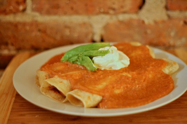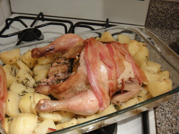 Ég leitaði vítt og breitt að uppskrift sem mér fannst ég ætti að geta treyst þegar ég mundi að Inga vinkona mín (matargúru með meiru) hafði mælt með uppskrift frá Jamie Oliver. Ég ákvað því að skella mér á hana og fiffaði hana aðeins lítillega til. Það var líka sumt í uppskriftinni sem gekk ekki alveg eins vel upp og Jamie vildi telja mér trú um. Brauðteningarnir urðu eiginlega bara blautir og óspennandi við það að liggja í fitunni af kjúklingnum og beikoninu þannig að ég dreifði þeim á bökunarpappír og skellti þeim aftur inn í ofn og eftir nokkrar mínútur urðu þeir stökkir og fínir. Þetta gæti samt hafa orsakast sökum þess að beikon hérna í Bandaríkjunum er alveg sjúklega feitt, hefði ég notað pancetta (eins og Jamie mælir með) þá hefði botninn á mótinu kannski ekki orðið svona mikill fitupollur. Séu þið (eða þeir sem þið eruð að elda fyrir) eitthvað smeykir við ansjósur þá mæli ég nú bara með að prófa það samt. Þegar ansjósurnar hafa verið marðar og blandaðar saman við créme fraiche, sítrónu og olíu þá hverfur sterka bragðið af þeim og þær gefa dressingunni fyllingu og gott saltbragð. (Sleppið því bara að segja hinum matvöndu frá því).
