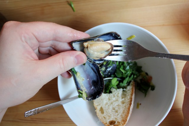 Elmar hófst handa þegar heim kom og skrúbbaði kræklingana til að losa þá við hreistur og annan óþrifnað sem sest utan á skeljarnar. Því næst togaði hann ,skeggið’ af kræklingunum, henti opnum skeljum sem lokuðu sér ekki sjálkrafa eftir að hafa bankað þeim léttilega í eldhúsbekkinn og skolaði þá í köldu vatni. Það er mjög mikilvægt að láta kræklingana ekki liggja í bleyti þar sem þeir eru saltvatnsdýr og kafna í kranavatninu. Hafið líka í huga að jafnvel þótt kræklingur sé harðlokaður þegar hann er keyptur er best að athuga hvort hann sé ekki örugglega á lífi – það má t.d. gera með því að kreista skeljarnar aðeins saman og sjá hvort hann veiti einhverja mótstöðu. Við studdumst við þetta myndband við verkunina.