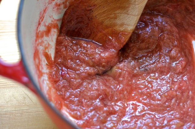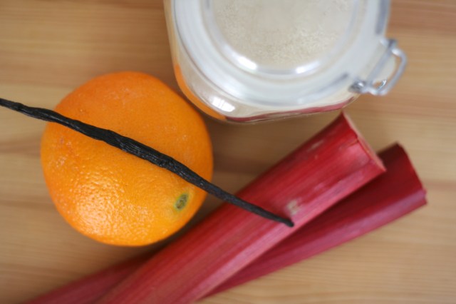 Rabarbarinn er látinn liggja í sykri og sítrussafa áður en honum er dreift yfir kökudeigið og það gerir það að verkum að hann heldur sínu sérkennilega súra bragði án þess að það valdi andlitsgrettum. Þið skulið samt hella safanum sem rabarbarinn liggur í yfir kökuna til að fá rétt bragð og sætumagn.