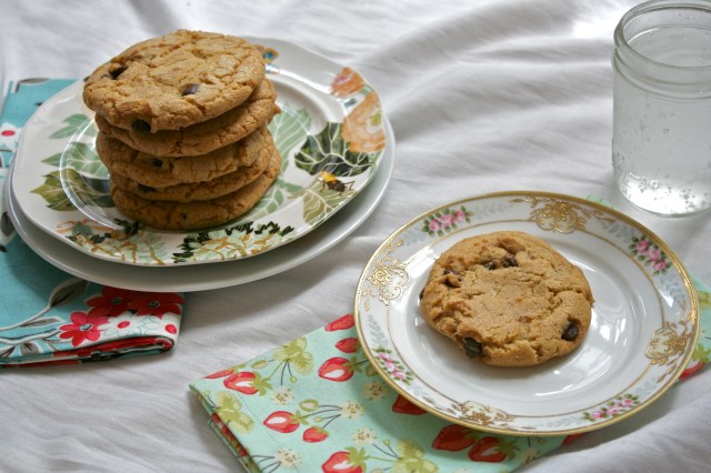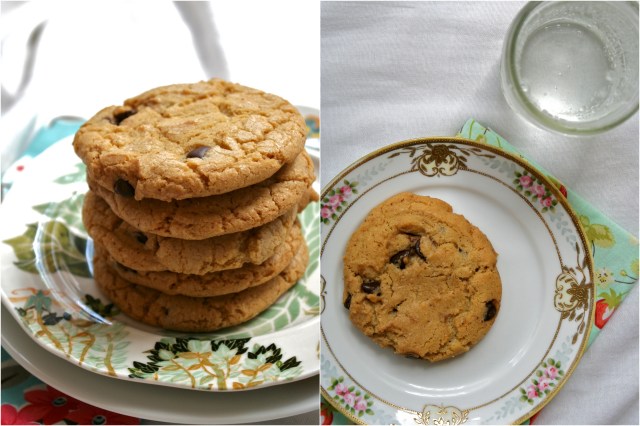 Það eru bara örfáir dagar síðan ég lofaði sjálfri mér að kveikja ekki á ofninum það sem eftir lifir sumars. Eldhúsið okkar er innst í litlu stúdíóíbúðinni okkar, er gluggalaust og ofninn er risastór. Þegar loftkælingin er ekki í gangi (en henni er stjórnað af eigendunum uppi) þá er það ekki heiglum hent að fýra upp í skrímslinu því innan nokkurra mínútna verður íbúðin alveg bullsjóðandi heit. En mig langaði bara svo mikið í smákökur að ég stillti vifturnar á fullt, sneri rofanum og reyndi að hafa hraðar hendur. Og útkoman var alveg þess virði – súkkulaðibitakökur með brúnuðu smjöri og kókos. Reyndar fannst mér kókosbragðið heldur milt og mæli með að skella smá meira kókosmjöli heldur en uppskriftin kveður á um.